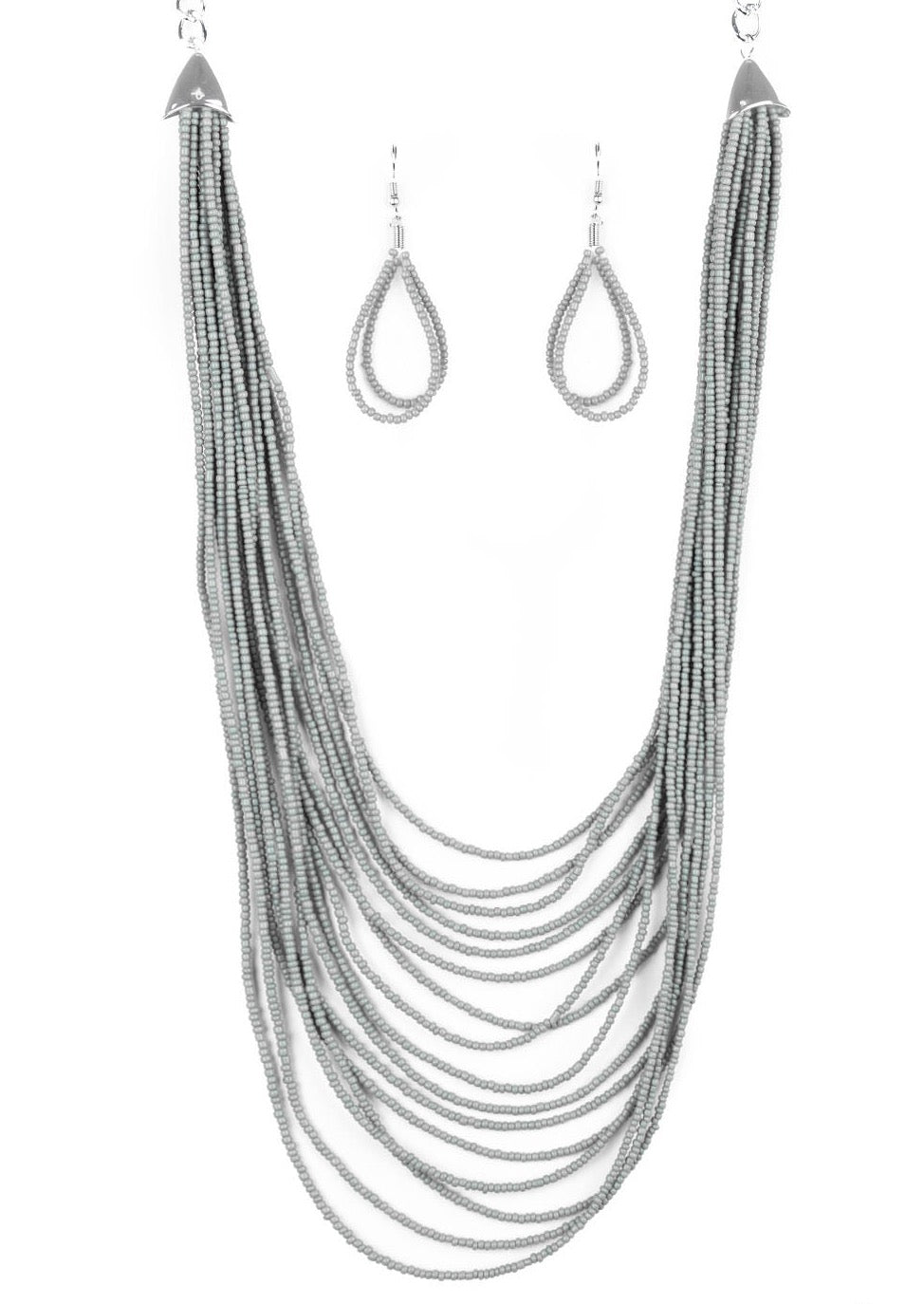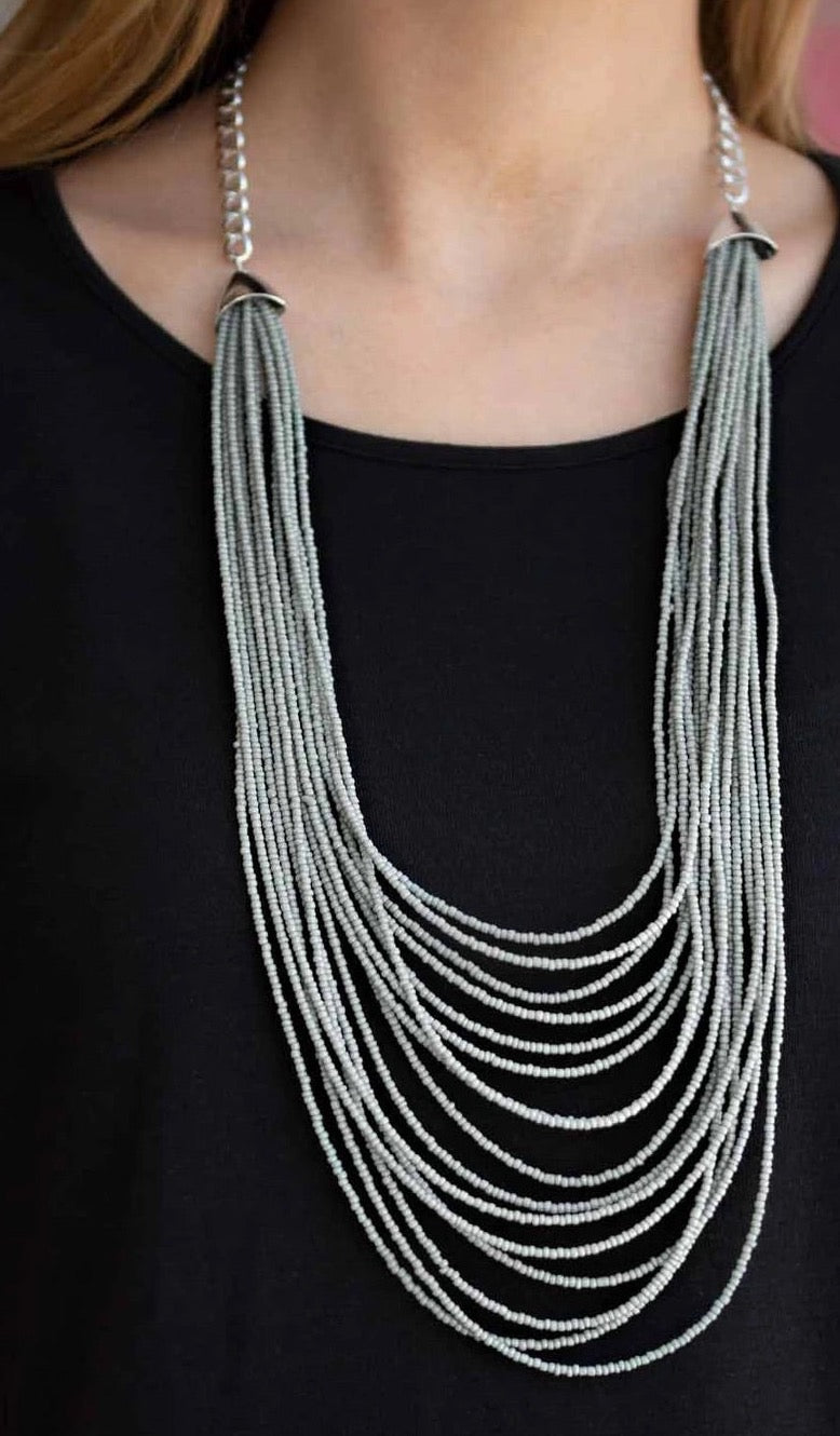 Infused with two bold silver fittings, row after row of gray seed beads layer across the chest for a seasonal fashion. Features an adjustable clasp closure.